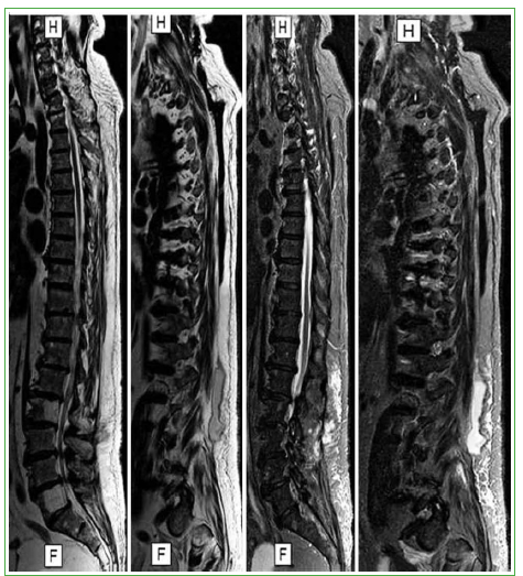 Figura 2. Resonancia magnética de toda la columna T1, T2 y STIR, corte sagital. Se visualiza una colección