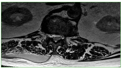 Figura 3. Resonancia magnética, corte axial, nivel L1. Se observa una colección subaponeurótica
