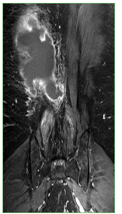 Se realizan dos drenajes percutáneos (31 de julio de 2018), 20 ml y 50 ml, respectivamente, con cultivos positivos para S. aureus sensible a meticilina y resistente a gentamicina. Se inicia el tratamiento antibiótico específico. Ante la evolución tórpida, la persistencia del dolor, los registros febriles y el aumento de los parámetros de laboratorio (eritrosedimentación 30 y proteína C reactiva ultrasensible 2,77 mg/l), se decide realizar un drenaje quirúrgico (150 ml de débito). En los cultivos, se rescata el mismo germen, por lo cual se le administra un tratamiento específico por vía intravenosa, durante cuatro semanas. Continúa con tratamiento oral ambulatorio y controles en el Servicio de Infectología. Su evolución es favorable.