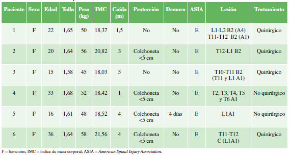 Resultados: La muestra incluyó a 6 mujeres, con un promedio de edad de 24 años y un índice de masa corporal de 19,29. Caída de 3,08 m de altura, cuatro con colchoneta <5 cm. Las lesiones principales fueron: 6 A1, 4 B2 y 1C. No se observaron déficits neurológicos. Cuatro pacientes fueron sometidas a cirugía.