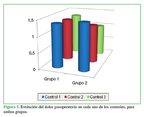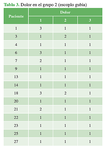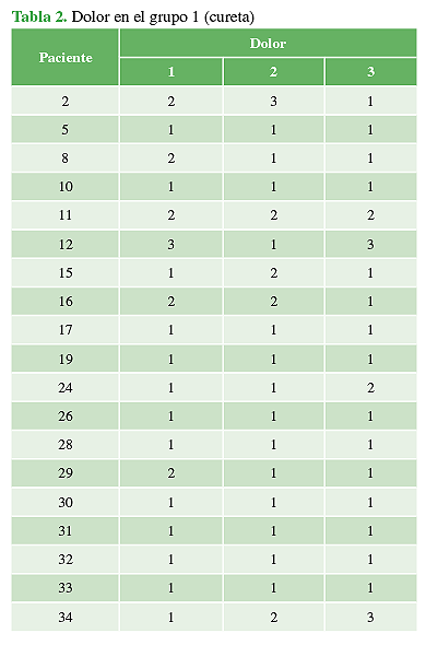 Resultados: Grupo 1: 19 pacientes (14 mujeres y 5 hombres). Se requirieron, en promedio, 9.94 min para obtener 9,26 g. En el primer control, 13 pacientes presentaron un valor 1; 5, un valor 2 y uno, un valor 3. En el tercer control, 15 tuvieron un puntaje 1; 2, un puntaje 2 y 2, un puntaje 3. Grupo 2: 15 pacientes (12 mujeres y 3 hombres). Se tomaron 11,26 g en 8,6 min. En puntaje de dolor en el primer control fue: 10 pacientescon un valor 1; 2, con un valor 2 y 3, con un valor 3, todos tuvieron un puntaje 1 en el tercer control.