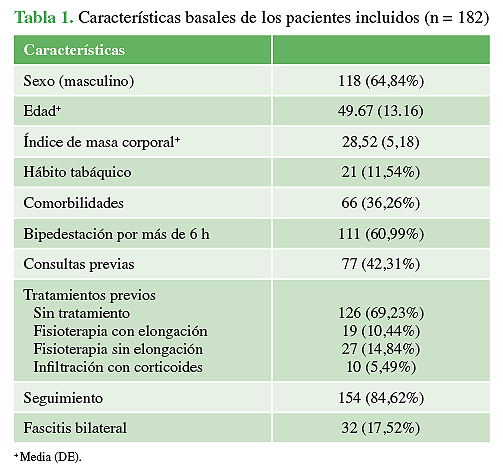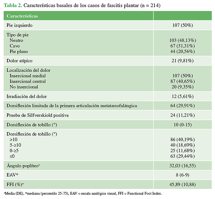 Materiales y Métodos: Se evaluó a una cohorte prospectiva de pacientes con diagnóstico de fascitis plantar. Cada participante completó una escala ordinal visual de dolor (del 1 al 10) para dolor del primer paso y dolor al final del día y encuestas FFI-R (Foot Function Index-Revised). También se realizó una evaluación demográfica. La dorsiflexión de la articulación del tobillo, el rango de movilidad de la primera articulación metatarsofalángica, la rigidez del gastrocnemio y el ángulo poplíteo también se evaluaron de manera estándar.